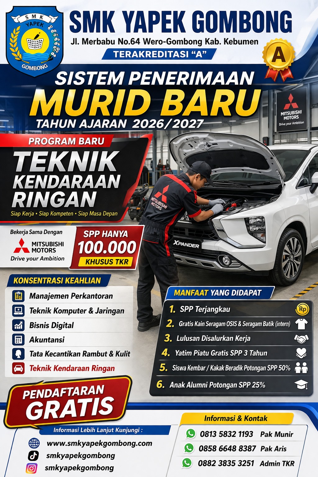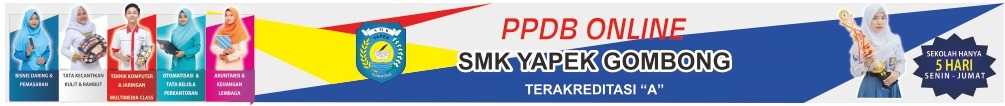 SELAMAT DATANG DI WEBSITE PENDAFTARAN PESERTA DIDIK BARU SMK YAPEK GOMBONG TAHUN PELAJARAN 2025/2026 SILAHKAN MASUK KE MENU FORMULIR PENDAFTARAN ISI SEMUA FORMNYA, APABILA BELUM LENGKAP DALAM MENGISI FORMULIR SILAHKAN ISI DENGAN TANDA (-). SEKIAN DAN TERIMA KASIH.